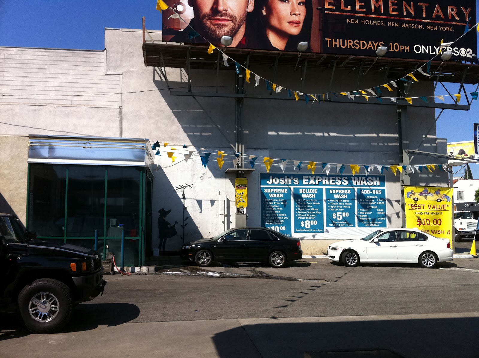 Yesterday a gas station and car wash displayed a rumored Banksy work that has been covered up for years. When I took a few photos with my phone camera, a worker told me, "Ten dollars for a photo." I laughed and he didn't push the point.